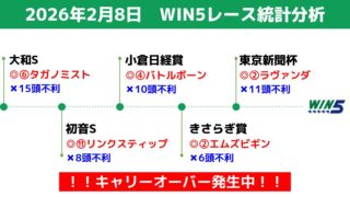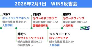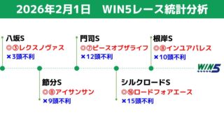 個別レース分析 2026年2月1日のWIN5レース統計分析 統計データに基づく「消し」で、少点数でWIN5を攻略。2026年2月1日のWIN5対象レースの過去の結果等を、統計データ分析。 2026.01.31 個別レース分析