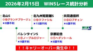 個別レース分析 2026年2月15日のWIN5レース統計分析 統計データに基づく「消し」で、少点数でWIN5を攻略。2026年2月15日のWIN5対象レースの過去の結果等を、統計データ分析。 2026.02.14 個別レース分析