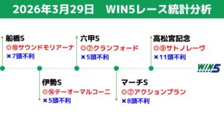 個別レース分析 2026年3月29日のWIN5レース統計分析 統計データに基づく「消し」で、少点数でWIN5を攻略。2026年3月29日のWIN5対象レースの過去の結果等を、統計データ分析。 2026.03.28 個別レース分析