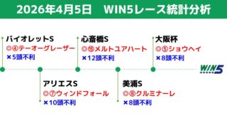 個別レース分析 2026年4月5日のWIN5レース統計分析 統計データに基づく「消し」で、少点数でWIN5を攻略。2026年4月5日のWIN5対象レースの過去の結果等を、統計データ分析。 2026.04.04 個別レース分析