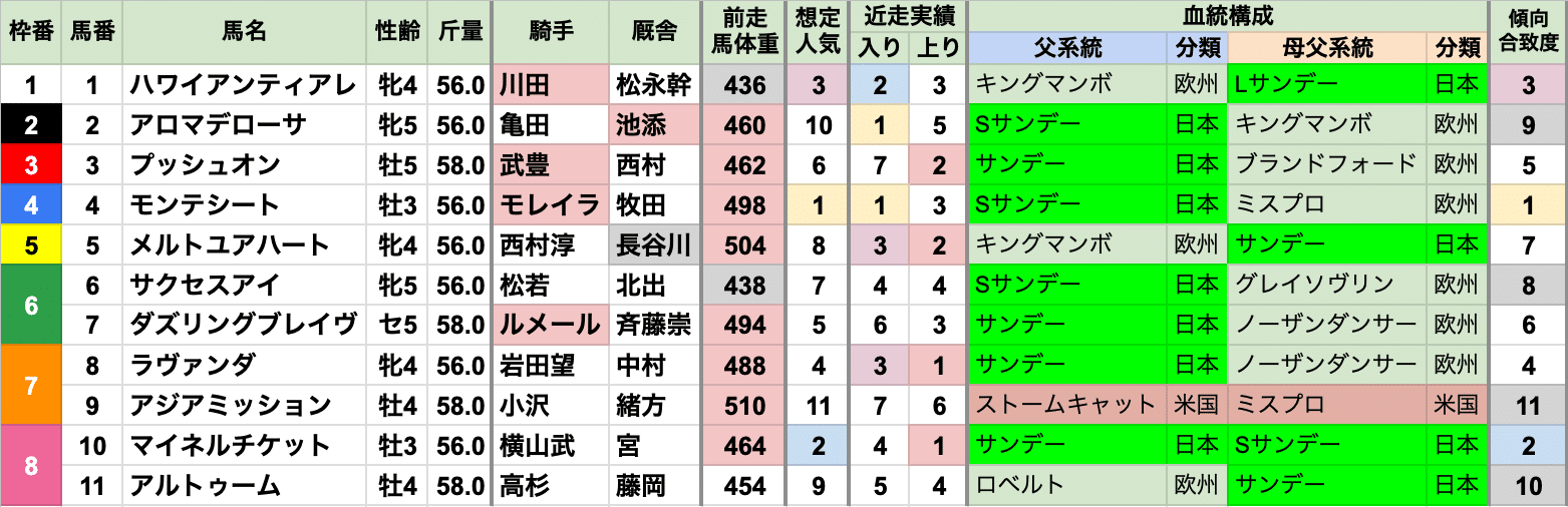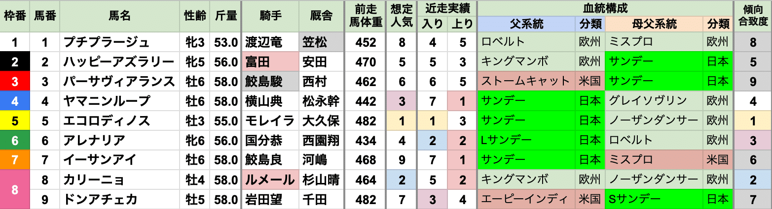 | 人気 | 4番人気以上で5勝していて、例年上位人気の連対率が高いが、 2021年のみ3着以内を9番人気以下で占めて大荒れしている |
