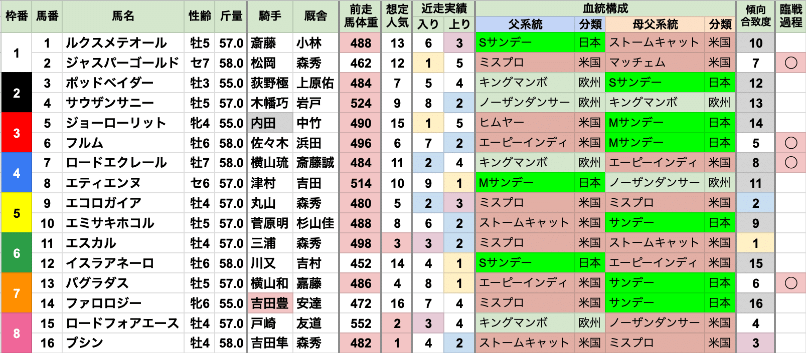 | 斤量 | 設定斤量52-59kg、勝ち馬斤量54-59kg 加算斤量別の着度数は以下の通り +3kg[1-0-0-3] +2kg[1-0-0-4] +1kg[0-0-2-12] 定量 [4-6-4-48] +1kgが連対率0%に対して、牝馬の+3kg1着、牡馬の+2kg1着が発生している |