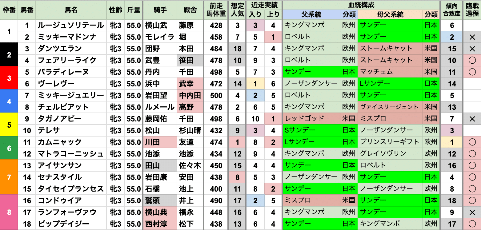 | 臨戦過程 | 前走でオークスを走った馬が6勝で過半数 それ以外はすべて、前走が1勝クラスかつ1着 前走が桜花賞/オークスでない、かつ1勝クラス1着でもないパターンは、 2001年以降発生していない |