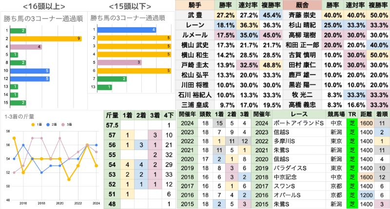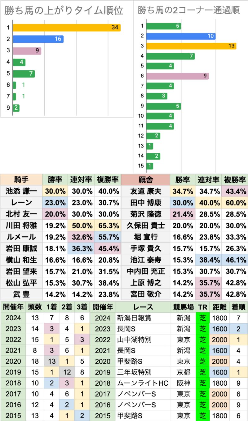 | 臨戦過程 | 信越Sと朱鷺Sからの臨戦が2勝ずつ それ以外に前走レースの重複は無いが、東京1400mが2勝、中京1600mが2勝で、 この3コースだけで8頭の勝ち馬を出している 重賞からの臨戦は2頭だけで、オープン特別/リステッド連戦組が有利な傾向 2022年に昇級初戦が勝っているが、これは15年ぶりだった |