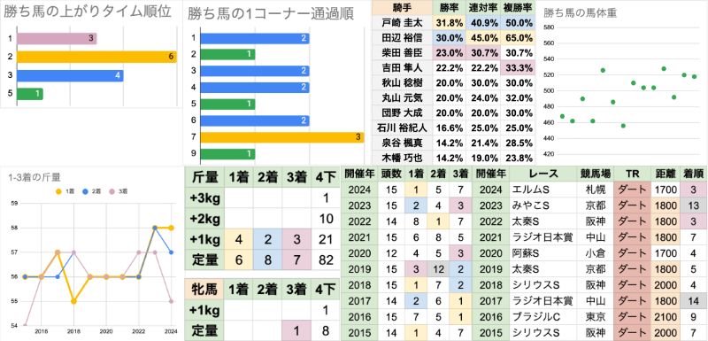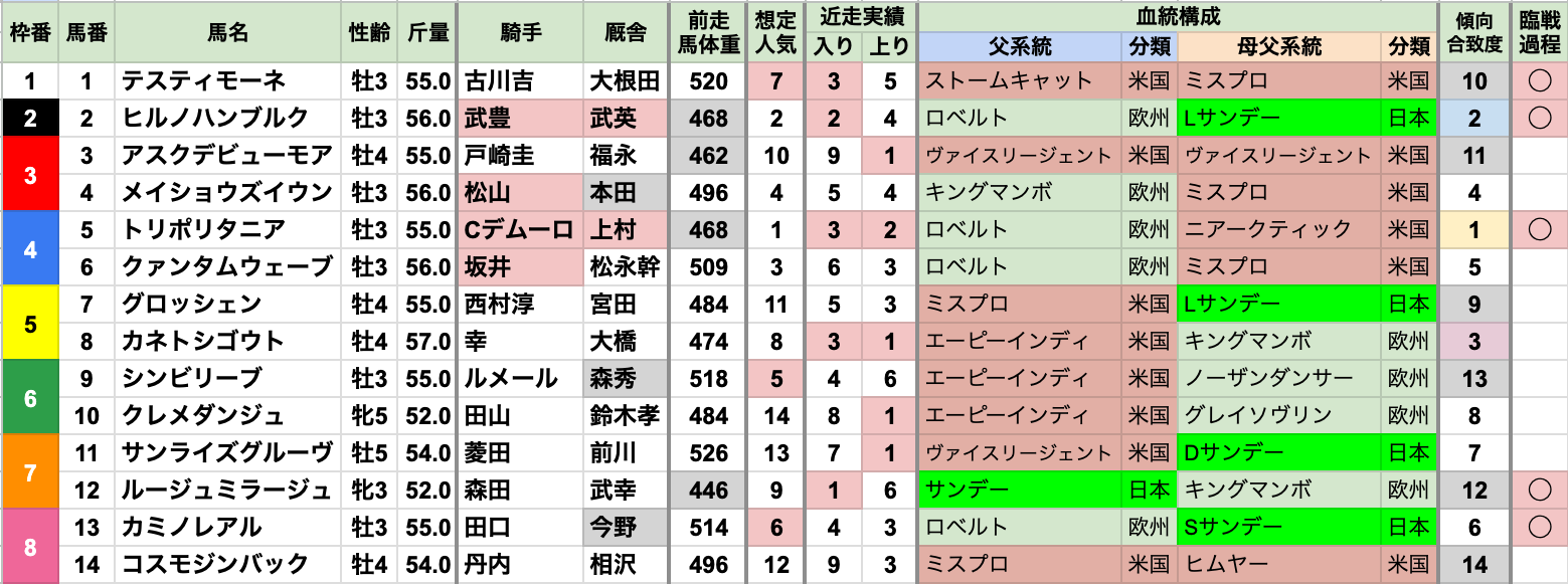 | 斤量 | 設定斤量54-59kg、勝ち馬斤量55-58kg 加算斤量別の着度数は以下の通り +3kg[0-0-0-1] +2kg[0-0-0-10] +1kg[4-2-3-21] 定量 [6-8-7-82] +1kgが有利で、勝率は定量馬の2倍以上 定量が増えた2023年以降も、2連勝している |