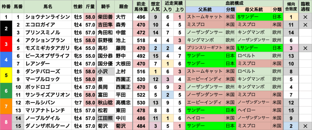 | 臨戦過程 | 前走で1800m以上を走った馬が8勝 前走の最高着順は3着で、着外が半数を占める 前走レースの重複は太秦S/ラジオ日本賞/シリウスSが2頭ずつだが、 それぞれ離れた時期に発生 似通った臨戦過程が連続して起きにくく、あまり偏りが無い |