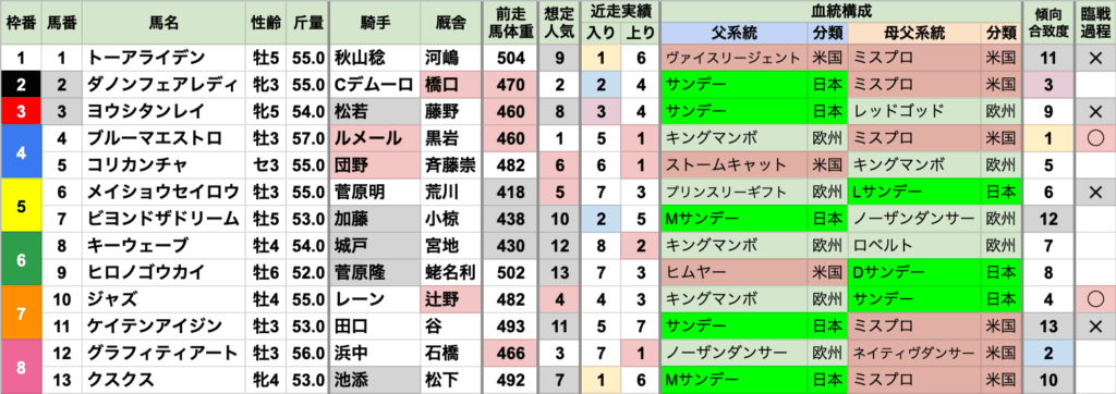 | 臨戦過程 | テレビ静岡賞から連勝が3頭で最多 前走も1400mだったのは6頭で、その内5頭が前走も東京 距離延長は2頭で、いずれも室町Sから(2023年以降は藤森Sが該当の番組) |