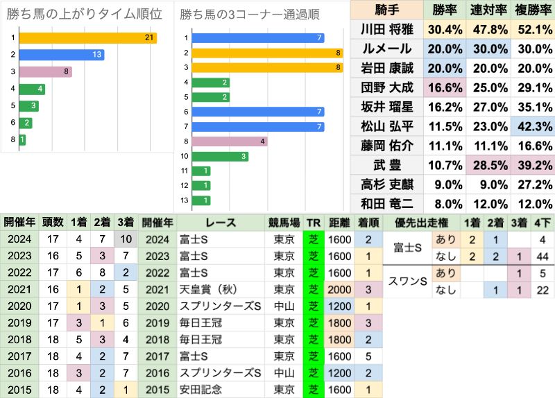 | 臨戦過程 | 富士Sからの臨戦が直近3連勝を含む4勝で最多 前走が東京だった馬が8頭で、 距離延長および、前走が東京でない勝ち馬は、スプリンターズSからのみ G3時代の富士Sを除くと、すべての勝ち馬が前走G2以上で、3着以内だったのが9頭 トライアルレース組の着度数は以下の通り スワンSからの勝ち馬は2010年を最後に出ていない 富士S / 1着[2-1-0-4] 富士S / 2着以下[2-2-1-44] スワンS / 1着[0-0-1-5] スワンS / 2着以下[0-1-1-22] |