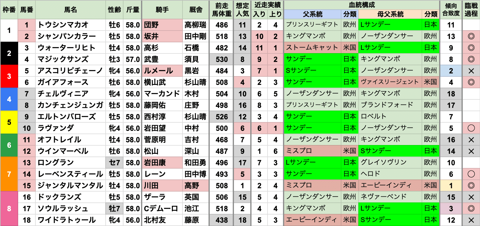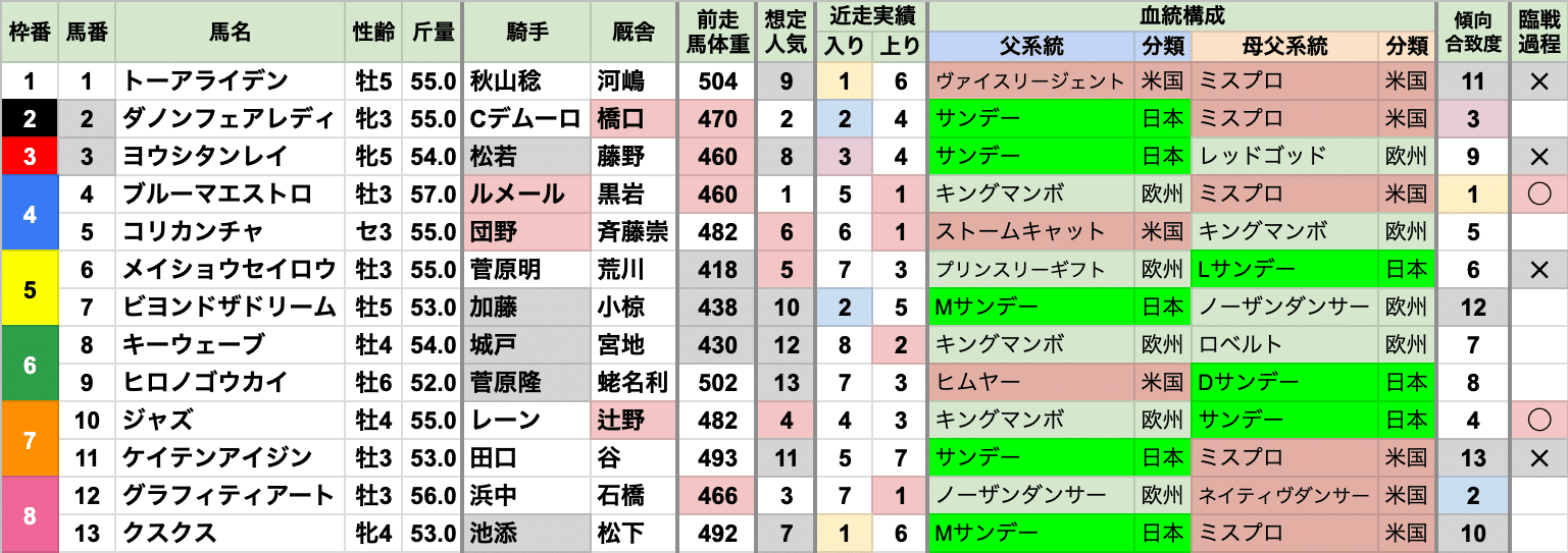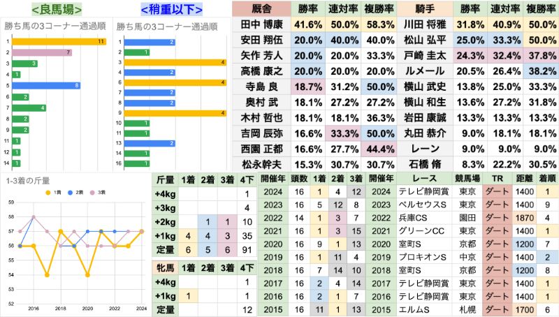 | 臨戦過程 | テレビ静岡賞から連勝が3頭で最多 前走も1400mだったのは6頭で、その内5頭が前走も東京 距離延長は2頭で、いずれも室町Sから(2023年以降は藤森Sが該当の番組) |