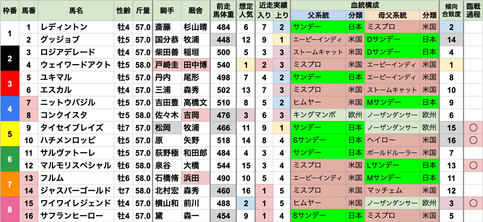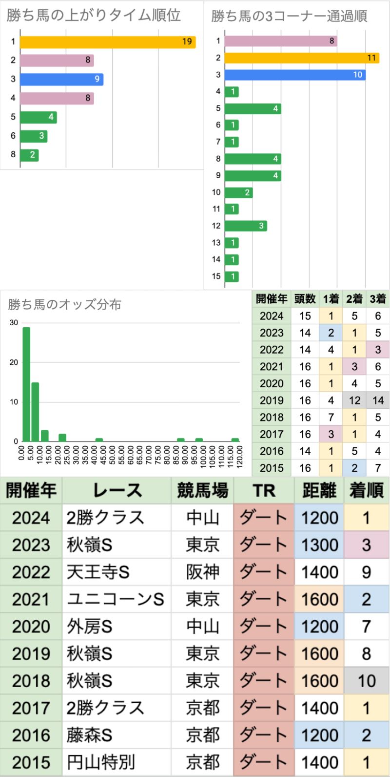 | 臨戦過程 | 続けて好走しやすく、前走1着が6頭で過半数を占める 2020年以降は、昇級初戦が3頭と、2勝クラスで2着だった馬が2頭で、 前走で連対していた馬が5連勝中 距離延長は不利で、2001年から施行されている当番組で、 前走が1500m未満の勝ち馬は未発生 前走が1500mの勝ち馬も、過去25回で2頭だけのレアケース |