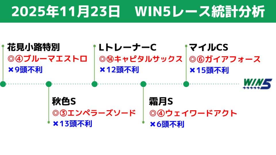 11/23(日)のWIN5対象レースの統計データを分析し、買える馬/消せる馬を検討します