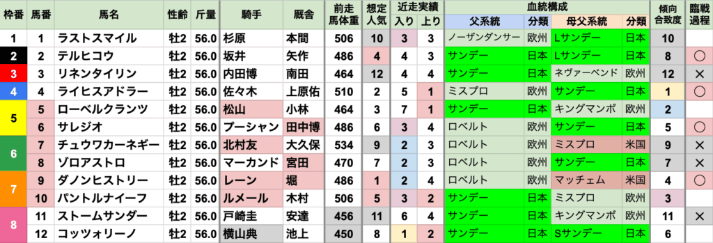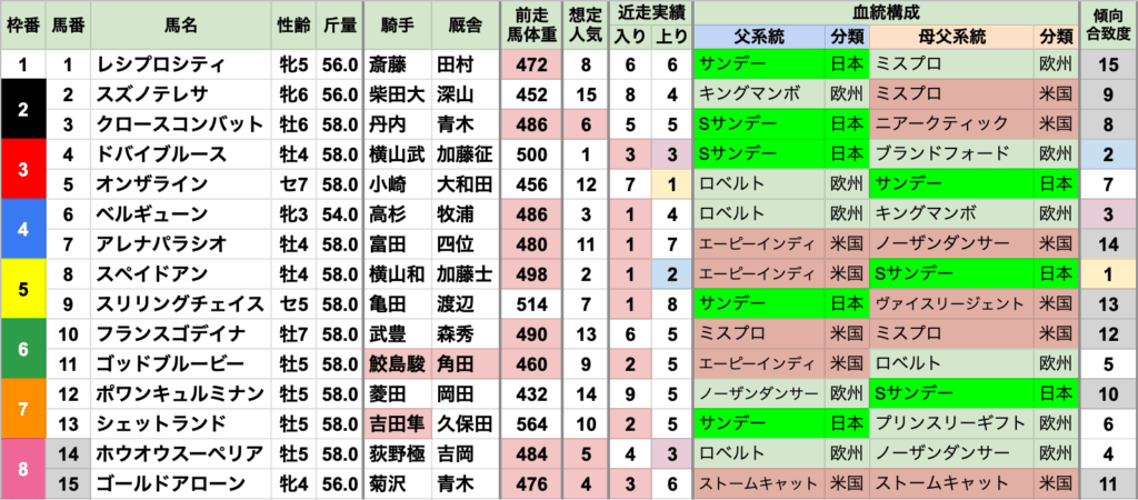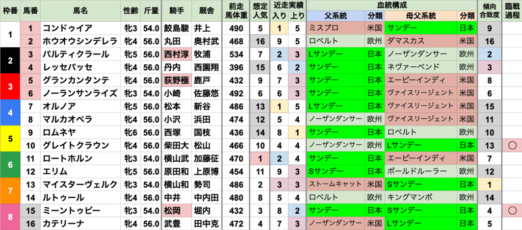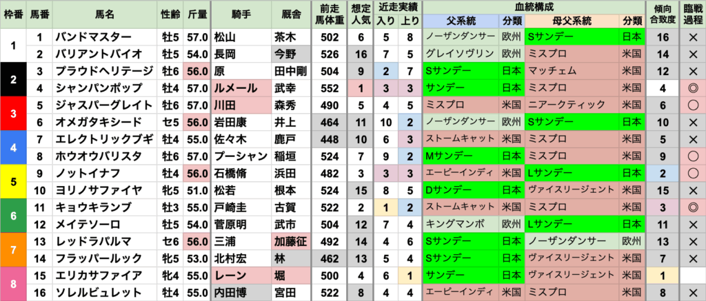 | 臨戦過程 | レース条件やコースも様々で、特に偏りなし 前走レースの重複は2020年/2021年の平城京Sだが、 代替開催のため施行されたコースが異なる 前走コースの重複は東京1600mが2頭だが、間が5年空いている |