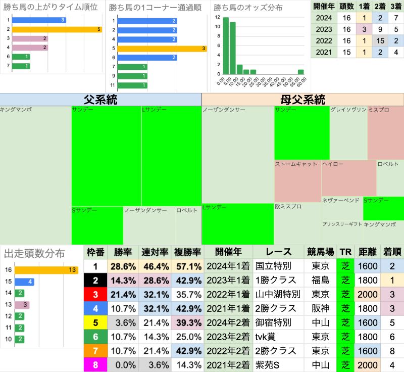 | 臨戦過程 | 勝ち馬すべて前走3着以内で、昇級初戦も1頭 過去4回の連対8頭を見ると、4頭が東京からの臨戦で、3年連続連対中 前走レースの重複は無く、距離も1600-2000mで分散している |