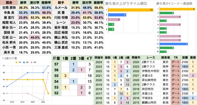 | 斤量 | 設定斤量52-57kg、勝ち馬斤量53-55kg 最も出走頭数の多い55kgが3勝している 頭数の少ない上下ともに、特に偏りなし |