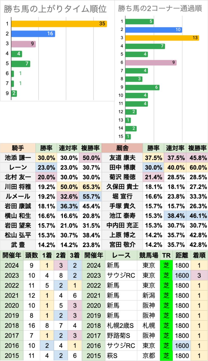 | 臨戦過程 | 近年は新馬勝ちからの臨戦が急増していて、直近6年で5勝 新馬戦以外も含めて前走1800mが8勝で、 異なるのはサウジアラビアRCから臨戦の2頭のみ 前走が1着でないのは、2023年にサウジアラビアRCで3着だった勝ち馬のみ これは、2004年以来20年ぶりのレアケースだった |