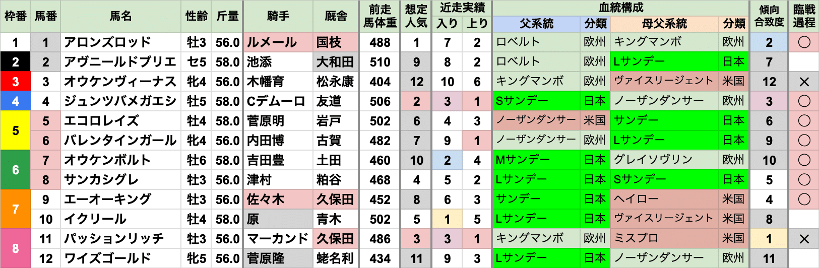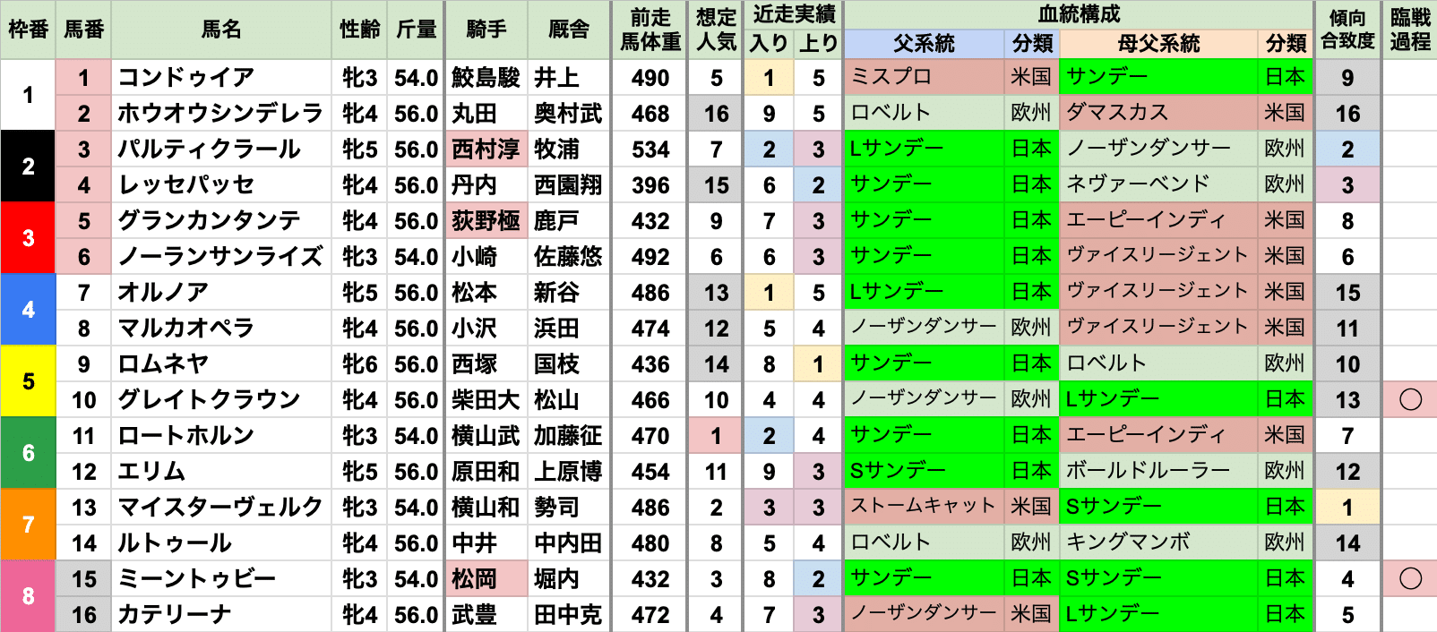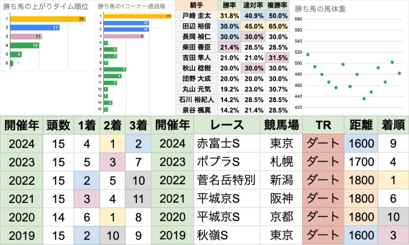 | 臨戦過程 | レース条件やコースも様々で、特に偏りなし 前走レースの重複は2020年/2021年の平城京Sだが、 代替開催のため施行されたコースが異なる 前走コースの重複は東京1600mが2頭だが、間が5年空いている |