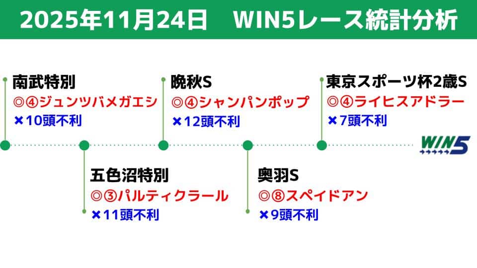11/24(月)のWIN5対象レースの統計データを分析し、買える馬/消せる馬を検討します