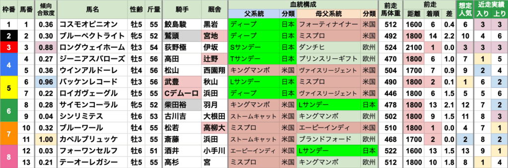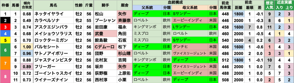 | 臨戦過程 | 前走クラスは新馬/未勝利と、オープンクラスが拮抗 前走レースの重複は野路菊Sと、京都2000mの新馬戦が2頭ずつ 前走も1着だった馬が7頭で、 オープンクラスも含めて、前走の最低着順は3着まで |