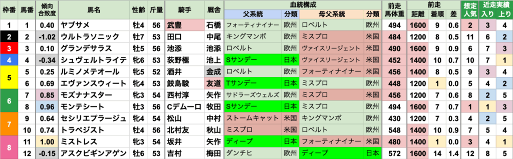 | 斤量 | 設定斤量53-58kg、勝ち馬斤量54-57kg 加算斤量別の着度数は以下の通り +2kg[0-0-0-2] +1kg[0-3-1-8] 定量 [10-7-9-118] 定量馬が22連勝中 このレースが1600mのオープンクラスになって以降の24回で、斤量加算馬は1勝だけ |