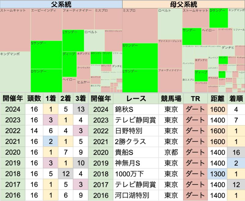 | 父または母父米国分類が75%を占めて、特に父では過半数 父系統の比率2位はキングマンボ系だが、 キングマンボ系の過半数は父/母父いずれも米国分類でない血統構成で、 米国分類を持たないパターンの主流となっている 大系統ノーザンダンサー系/ミスプロ系を中心に、短距離志向の能力が求められやすい傾向 |