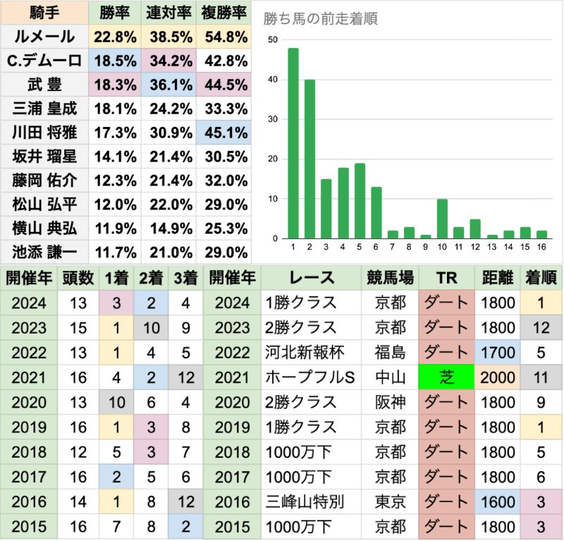 | 臨戦過程 | 前走も京都1800mを走った馬が6頭で過半数 阪神の3年間は前走条件がすべて異なり分散していたが、 京都に戻った2023年以降は、また京都1800mが2連勝している |