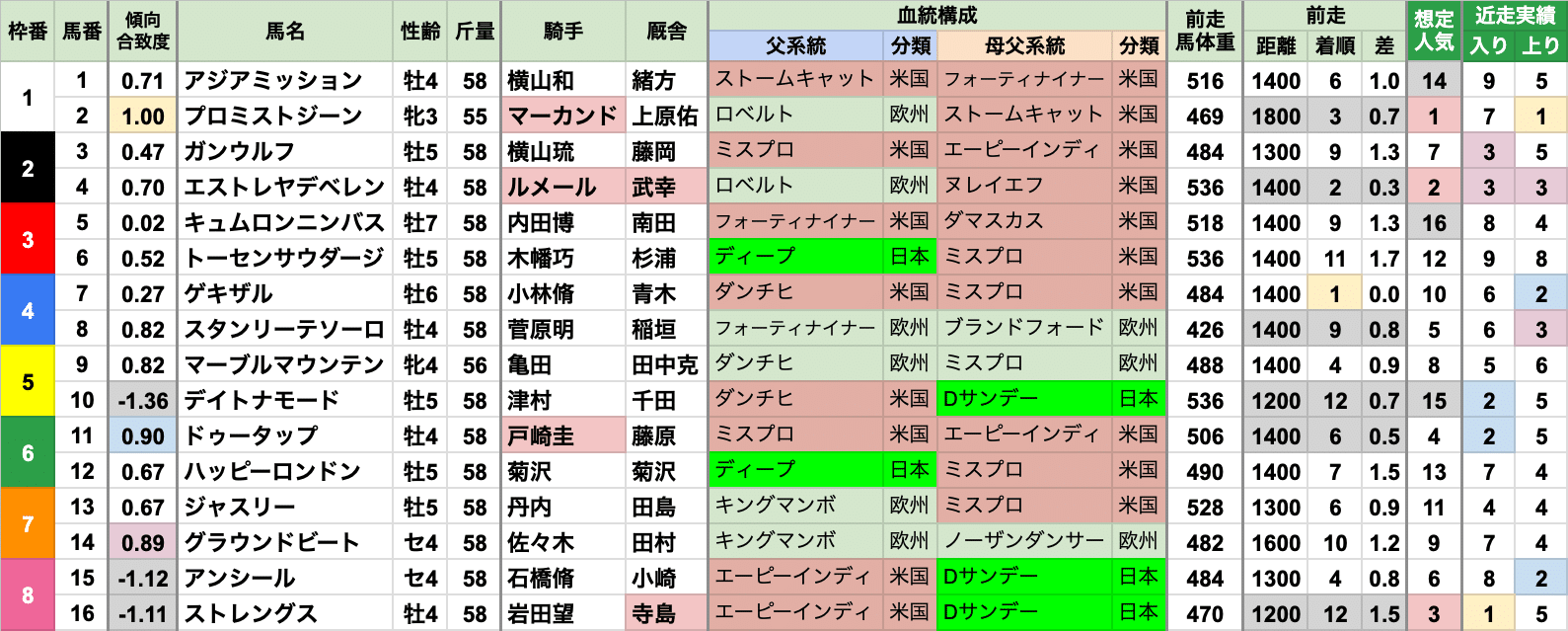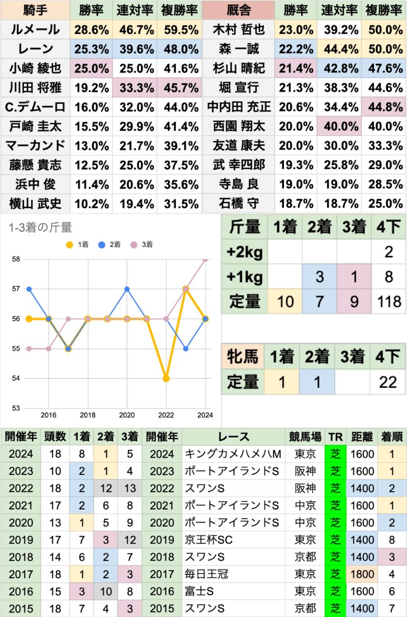| 臨戦過程 | 直近は前走2着以上が5連勝中 その内3頭がポートアイランドSからの臨戦 スワンSも3頭の勝ち馬を出していて、重賞の中では最も優勢 |