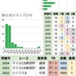 | 人気 | 1番人気が5勝、連対率80%で安定感があるが、 2020年8番人気、2022年7番人気と、荒れる頻度がやや上がっている 2020年以外は8番人気以下の複勝率0%で、大荒れはしにくい |