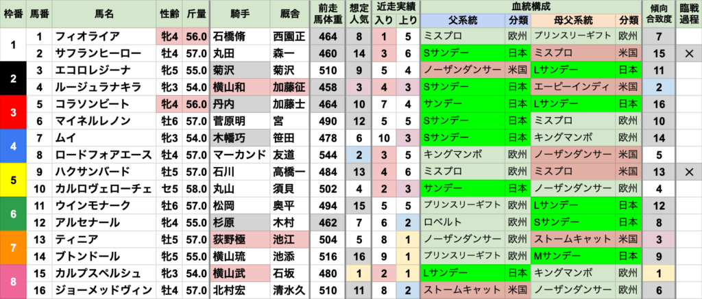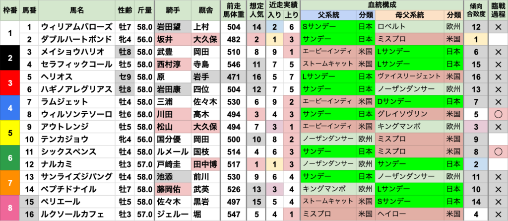 | 臨戦過程 | 2016〜2021年の6年間、重賞から臨戦が5勝していたが、2022年以降は未発生 直近3年は昇級初戦が2勝と、傾向が変化してきている 前走も1200mだったのが7勝で、距離短縮は重賞からのみ |