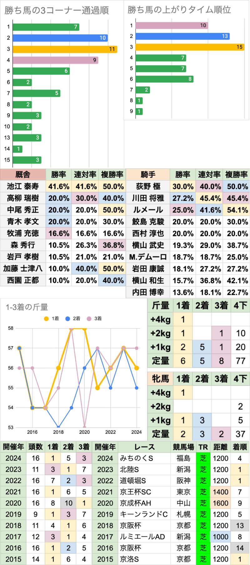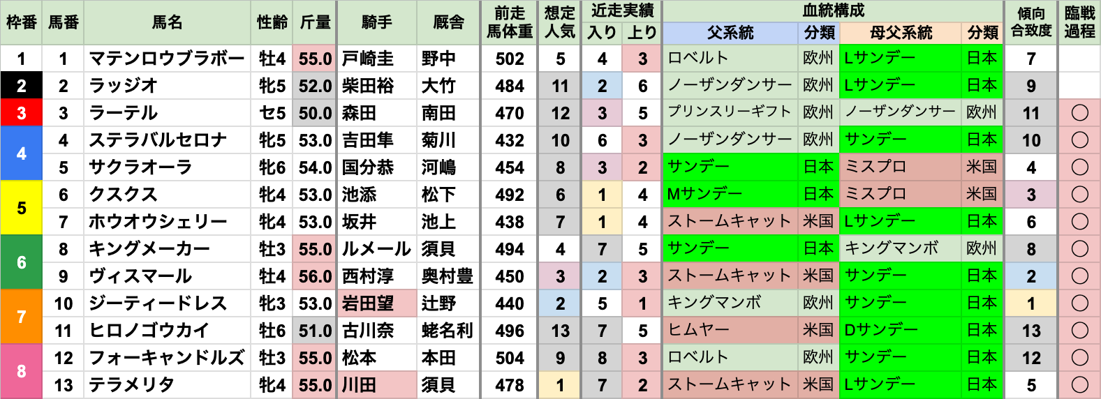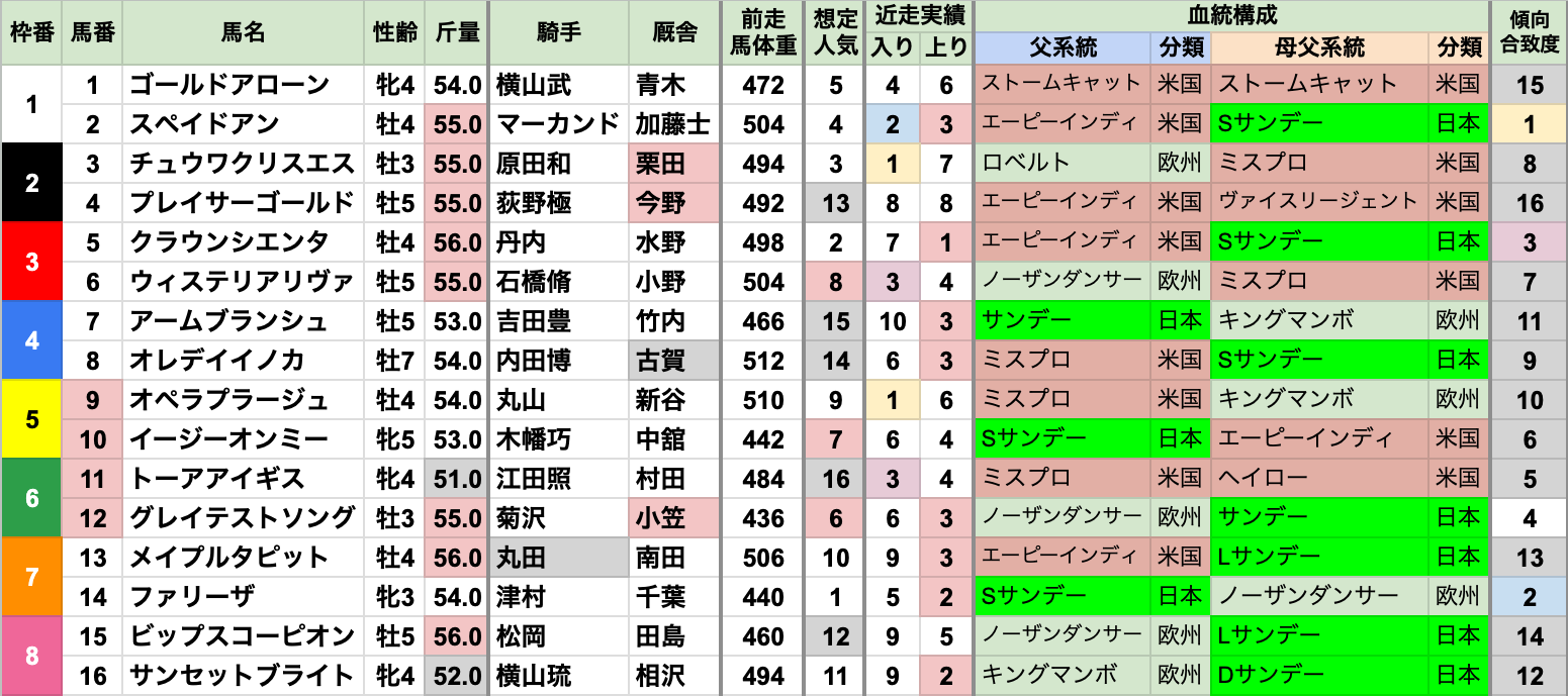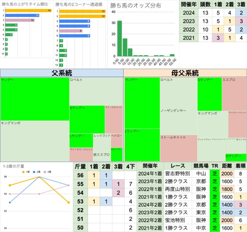 | 斤量 | 設定斤量50-57kg、勝ち馬斤量54-57kg 重ハンデ有利で、特に55-56kgの勝率/連対率が高い傾向 52kg以下は[0-0-2-14]で連対率0% |