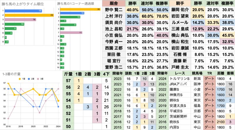 | 臨戦過程 | 2016〜2021年の6年間、重賞から臨戦が5勝していたが、2022年以降は未発生 直近3年は昇級初戦が2勝と、傾向が変化してきている 前走も1200mだったのが7勝で、距離短縮は重賞からのみ |