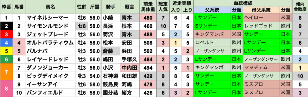 | 臨戦過程 | 前走2着以上が7頭で過半数 前走1着は4頭で、昇級初戦とオープン特別/リステッドが2頭ずつ 前走2着は3頭で、すべて重賞 |