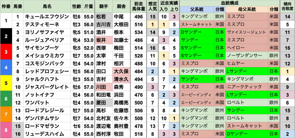 | 斤量 | 設定斤量53-59kg、勝ち馬斤量54-58kg 加算斤量別の着度数は以下の通り +3kg[0-0-0-1] +2kg[2-1-2-5] +1kg[1-1-3-16] 定量 [7-8-5-106] 直近は定量馬が4連勝中 勝率は+2kgが最高だが、2021年以降は3着以内なし |