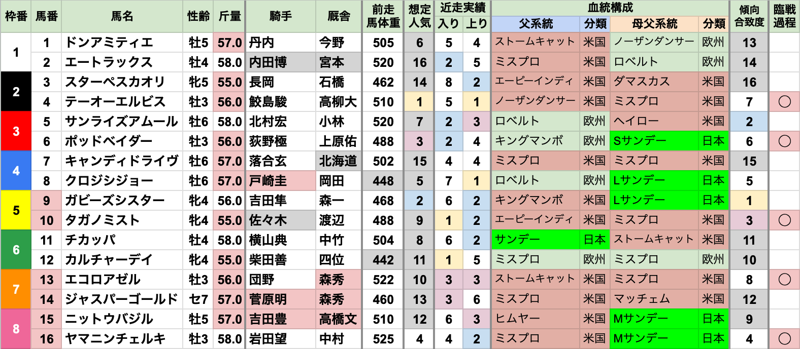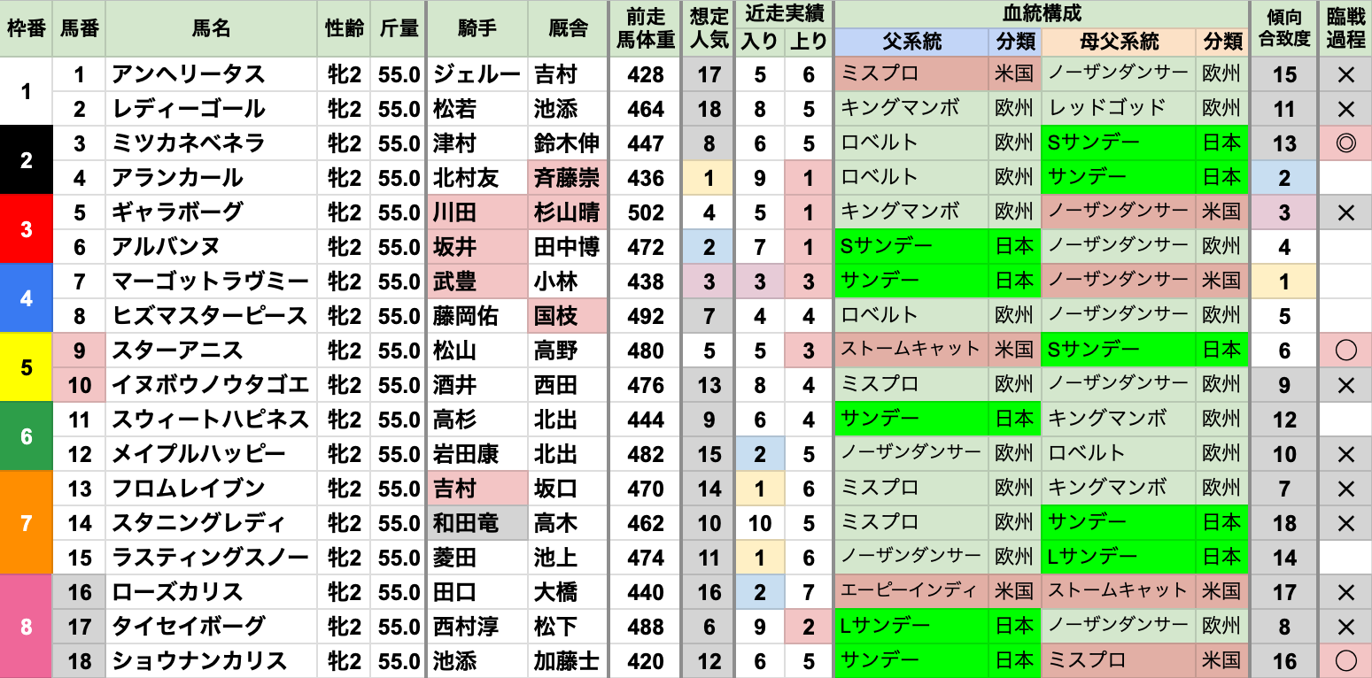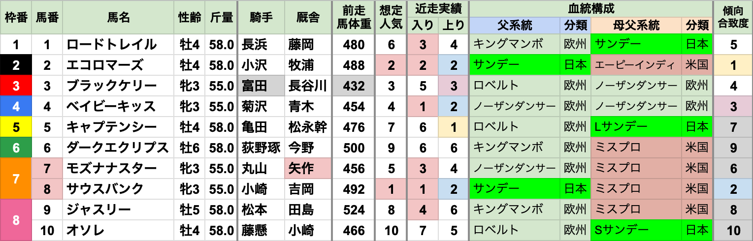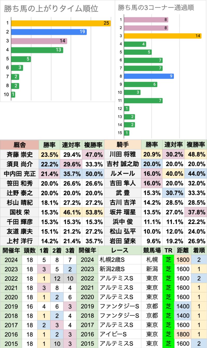 | 臨戦過程 | 前走2着以上が7頭で過半数 前走1着は4頭で、昇級初戦とオープン特別/リステッドが2頭ずつ 前走2着は3頭で、すべて重賞 |
