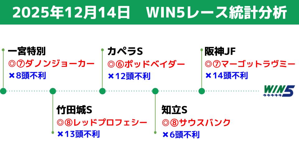 12/14(日)のWIN5対象レースの統計データを分析し、買える馬/消せる馬を検討します