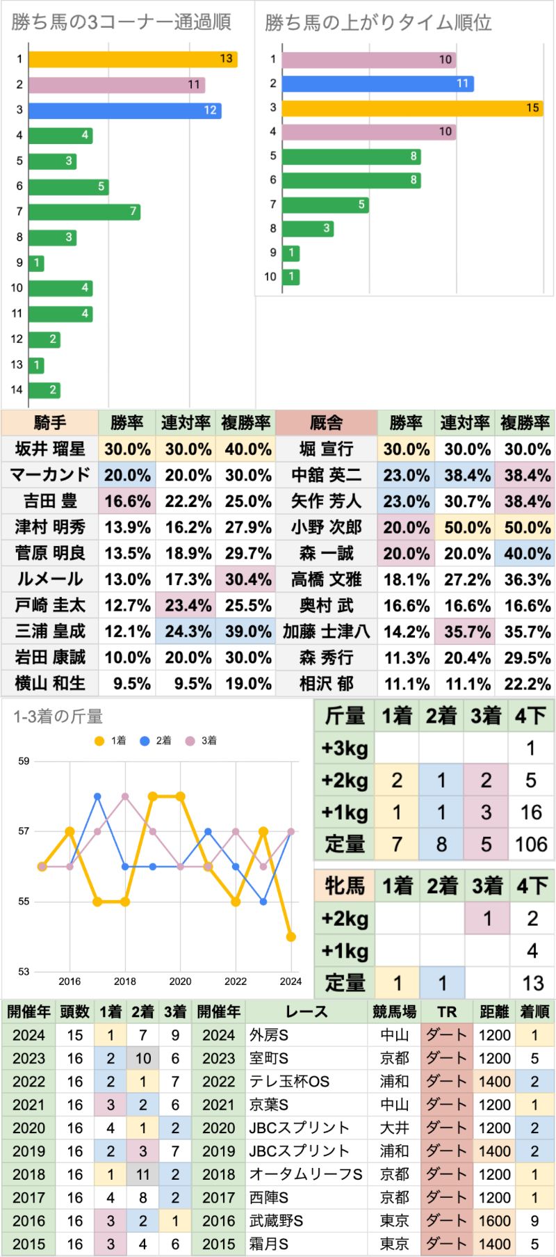 | 斤量 | 設定斤量53-59kg、勝ち馬斤量54-58kg 加算斤量別の着度数は以下の通り +3kg[0-0-0-1] +2kg[2-1-2-5] +1kg[1-1-3-16] 定量 [7-8-5-106] 直近は定量馬が4連勝中 勝率は+2kgが最高だが、2021年以降は3着以内なし |