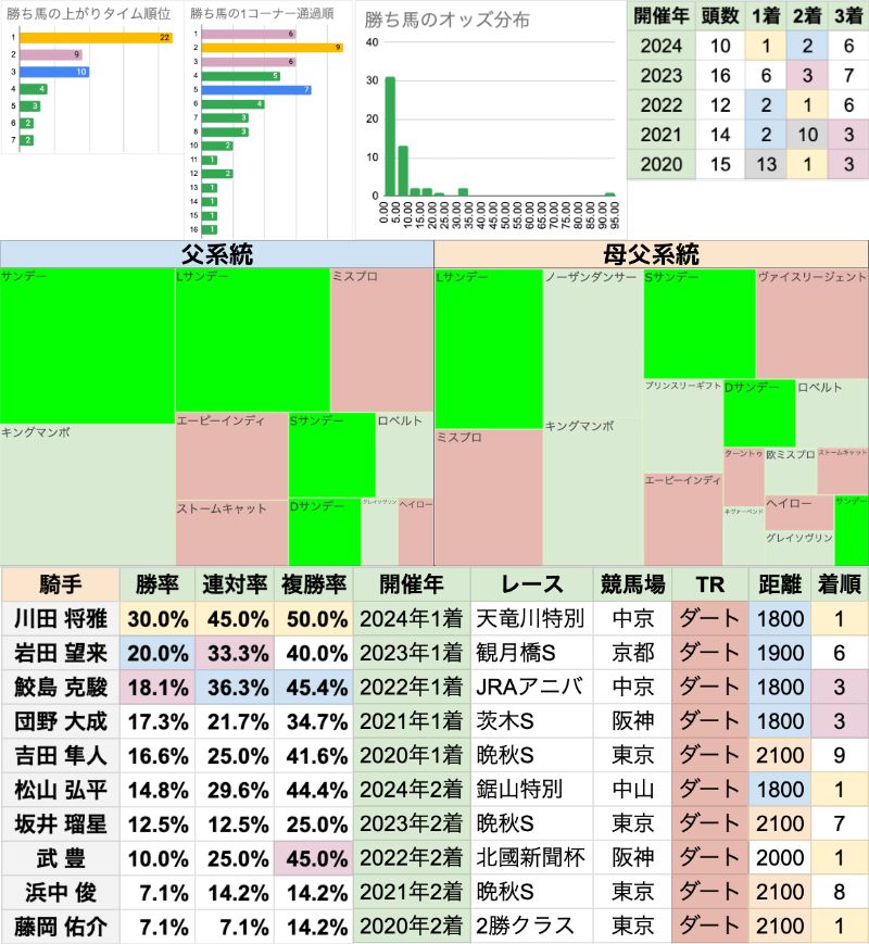| 臨戦過程 | 直近6年で前走1400mが4勝していて、距離短縮が優勢 前走レースの重複は、キビタキS/みちのくSが3頭、奥多摩Sが2頭 |