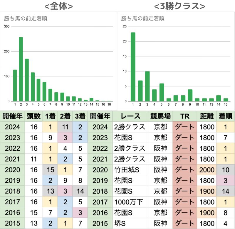 | 臨戦過程 | 秋の京都開催がある場合、そこで1800m/1900mを走った馬が有利 京都開催が無かった期間も、同時期の阪神からの臨戦が3連勝で、同じ傾向 勝ち馬は、前走着順と今回人気がほぼ一致している 昇級初戦の4頭は、その内3頭が直近4年間に集中し、頻度が上がっている |