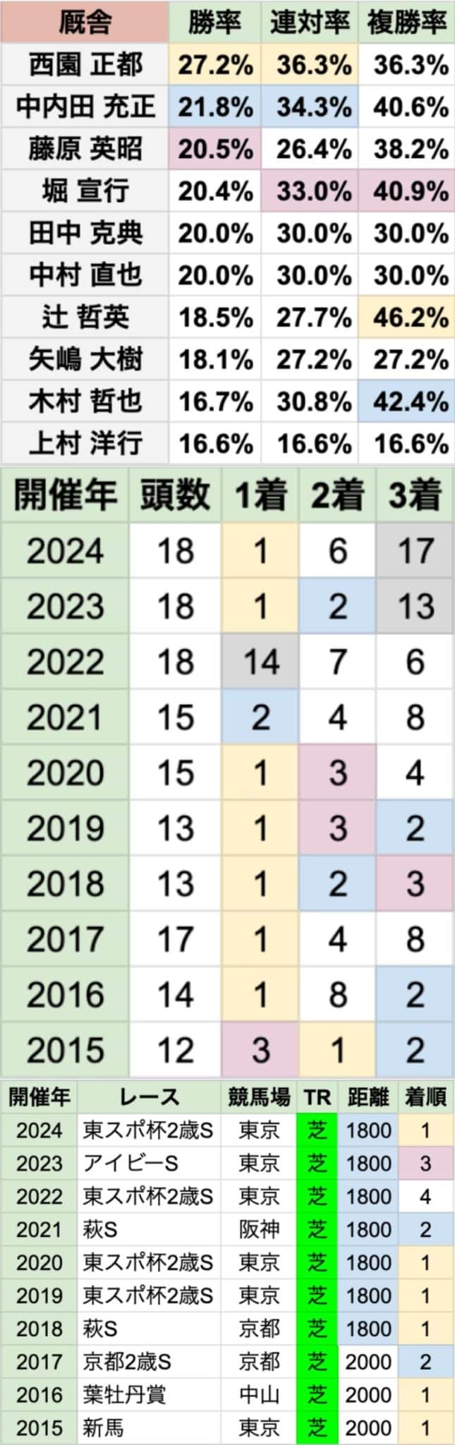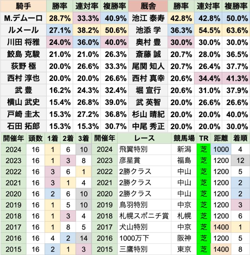 | 騎手は、M.デムーロ/ルメール/川田将雅の勝率が特に高い 全体の勝率に比べると、鮫島克駿/荻野極/石田拓郎は、この条件で高い 厩舎は、池江泰寿の勝率が飛び抜けて高い 池添学/奥村豊も、かなり高い水準 |