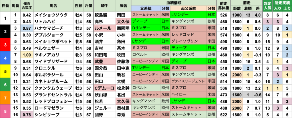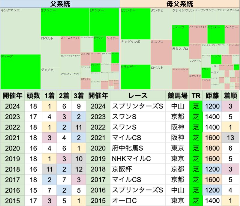 | 父または母父、欧州分類が75%を占める 欧州分類の中で最大比率は、父も母父もキングマンボ系 父ではロードカナロアが、母父ではキングカメハメハが過半数を占める どちらも欧州分類でないパターンは、ディープインパクト系/Shortサンデー系に二分される 最近は後継種牡馬にも分散し始めているが、概ねして、 ロードカナロア/ディープインパクト/ダイワメジャーあたりの要求度が高い傾向 |