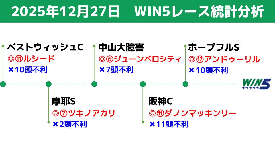 12/27(土)のWIN5対象レースの統計データを分析し、買える馬/消せる馬を検討します