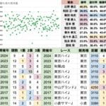 | 人気 | 1番人気が7勝していて、かなり荒れにくい 2022年に14番人気で大荒れして以来、 3年連続で二桁人気が3着以内に入っていて、やや荒れやすくなっている |