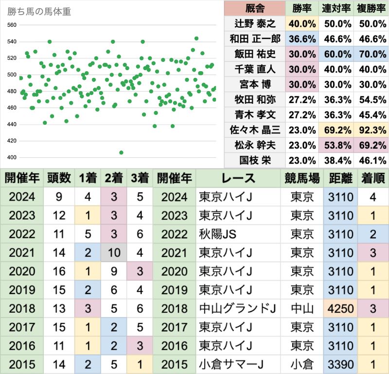 | 臨戦過程 | 勝ち馬すべて前走4着以内で、1着だったのが6頭で過半数 前走も重賞だった馬が10連勝中で、特に東京HJからの臨戦が7頭 |