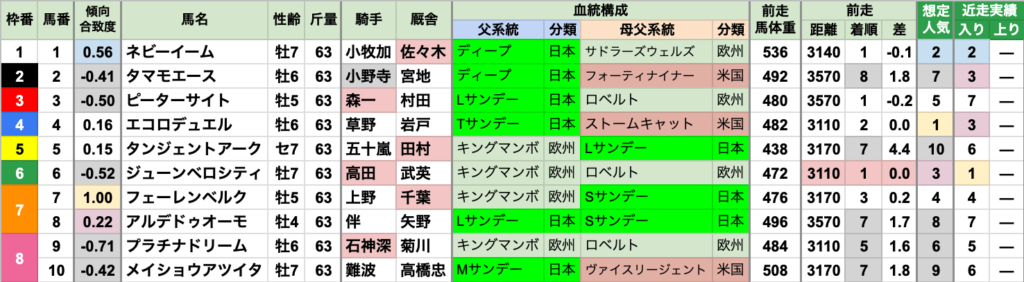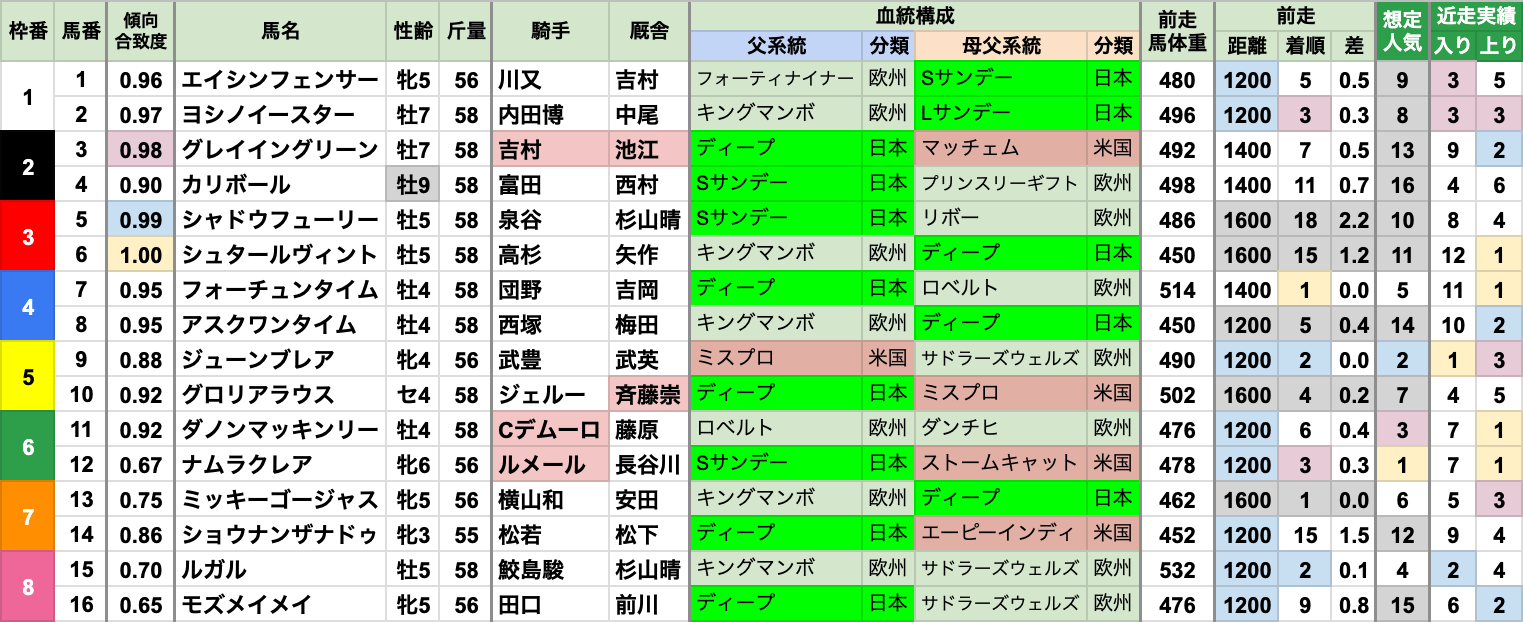 | 臨戦過程 | 前走レースの重複は、12月前半の2勝クラス/中山/芝1200mから3頭 それ以外は重複なしで、走ったコースもすべて異なる |