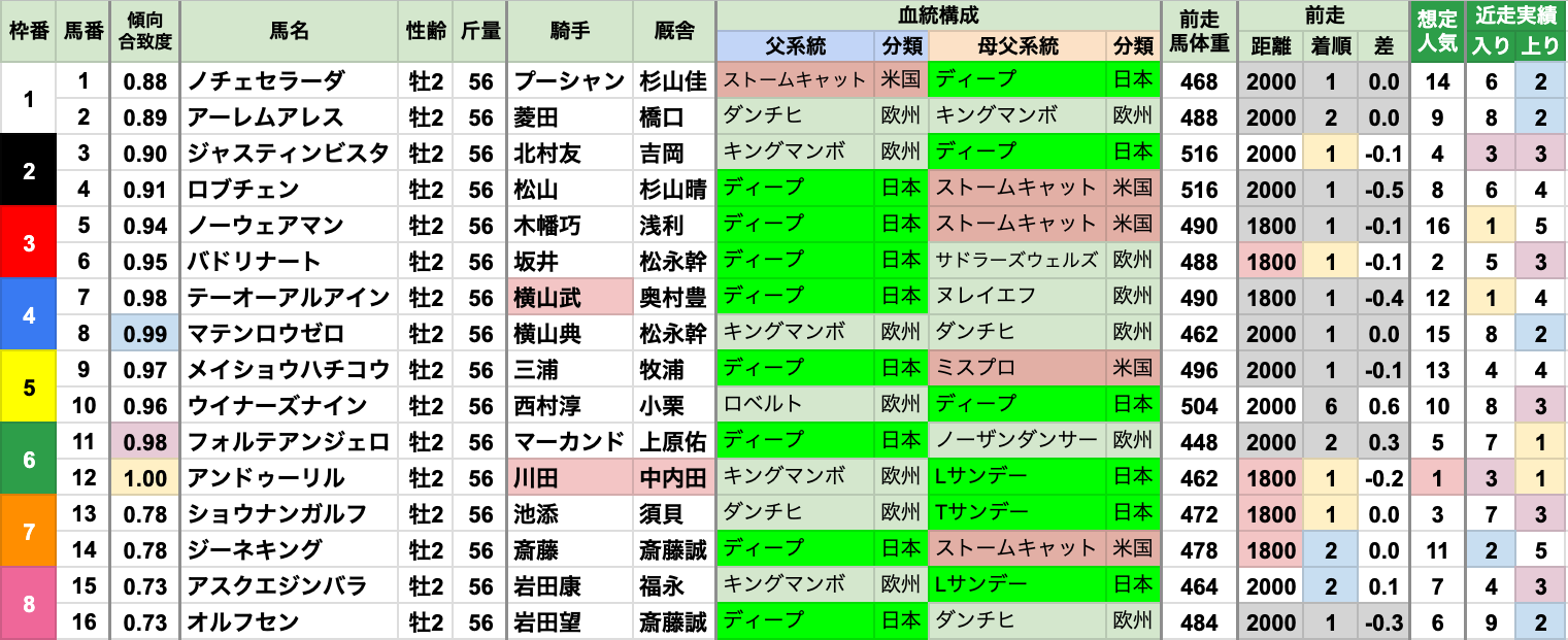 | 臨戦過程 | G1昇格以降は、前走でオープンクラスを走った馬が8連勝中 最多は東京スポーツ杯2歳Sから4頭で、直近は前走で1800mを走った馬が7連勝中 G2昇格以降は、前走で連対した馬が8連勝、特に1着だった馬が6勝していたが、 近年は3着/4着だった馬も勝ち始めている |
