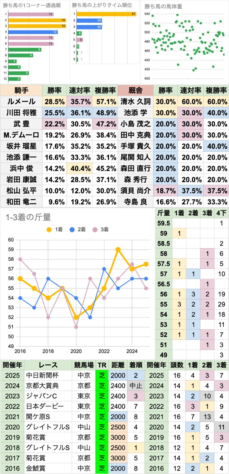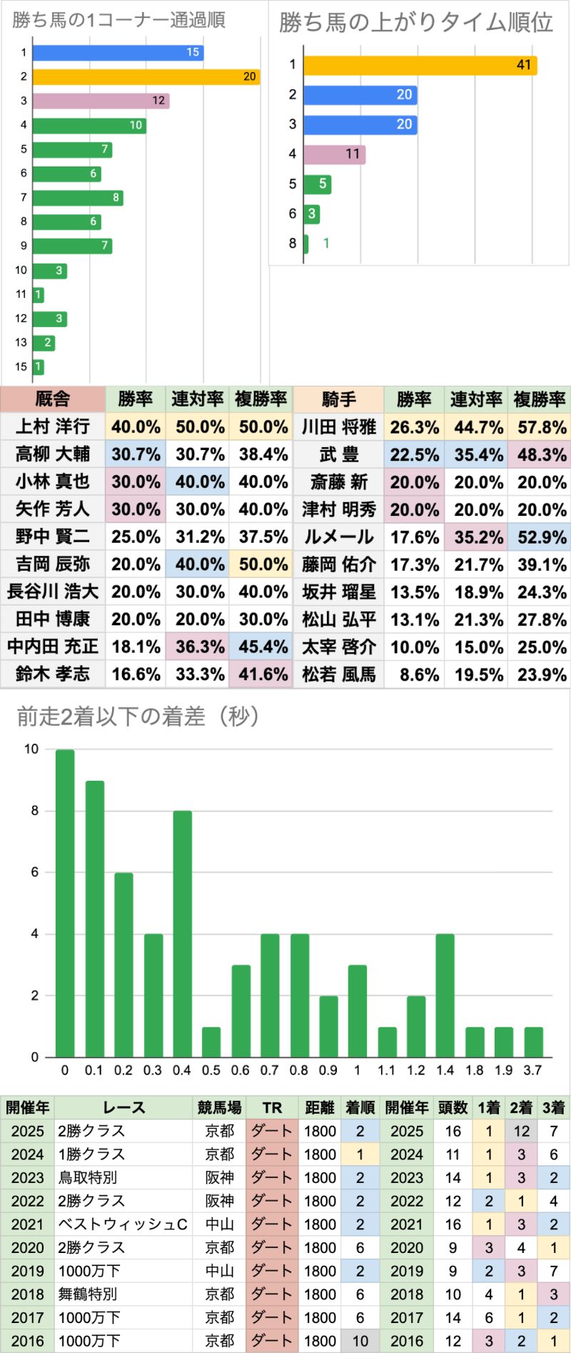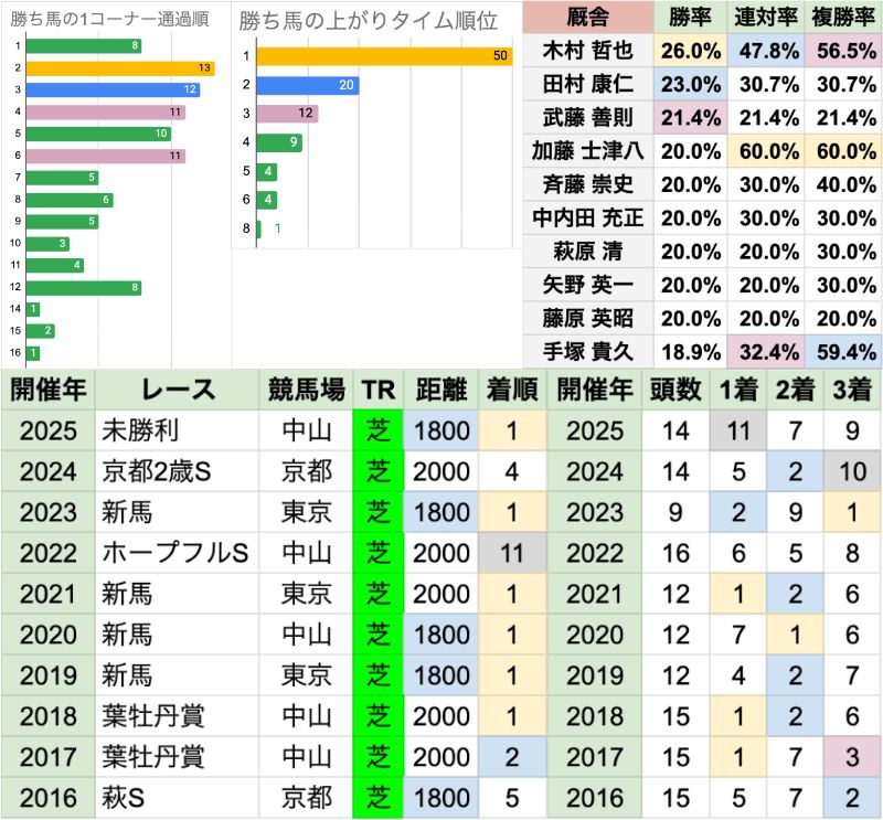 | 騎手は、ルメール/川田将雅/武豊の勝率が特に高い 全体の勝率に比べると、浜中俊/和田竜二は、この条件で特に高い 厩舎は、清水久詞/池添学の勝率が特に高い 全体の勝率に比べると、小島茂之/尾関知人/森田直行は、この条件で特に高いが、 小島茂之はほぼ、2018年までの数字 尾関知人/森田直行はそれぞれ、1着がグローリーヴェイズ/モズベッロのみと、 特定の馬で稼いだ数字になっている |