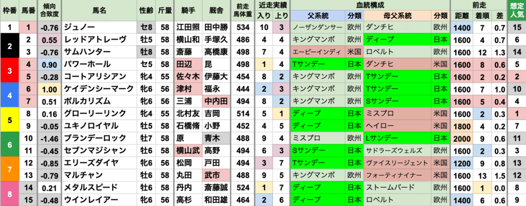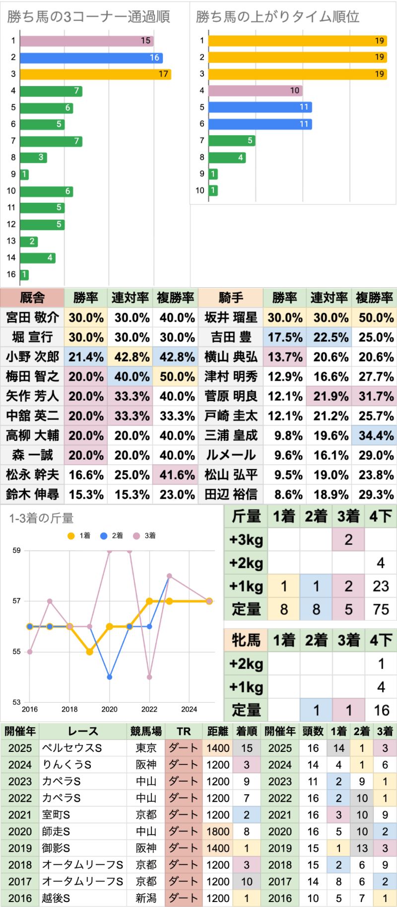 | 斤量 | 別定戦の設定斤量53−59kg、勝ち馬斤量55−57kg 加算斤量別の着度数は以下の通り +3kg[0-0-2-0] +2kg[0-0-0-4] +1kg[1-1-2-23] 定量 [8-8-5-75] 定量馬有利だが、+1kgの3着以内は2022年以降に集中している |