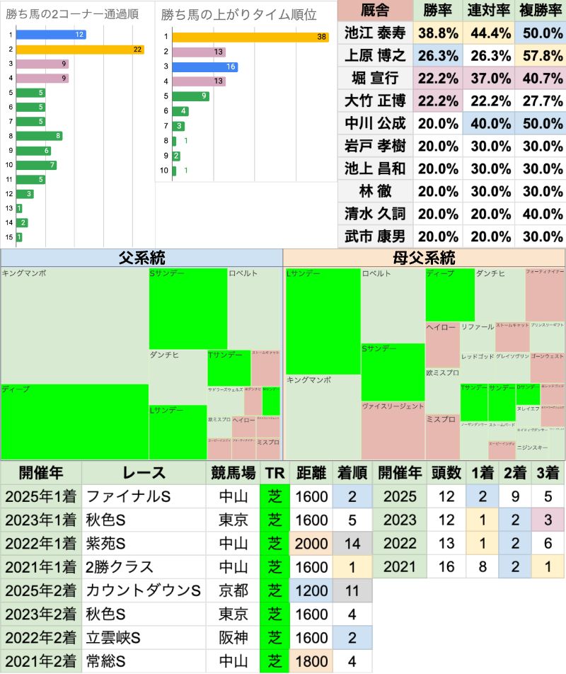 | 臨戦過程 | 勝ち馬の前走レースは重複なし 秋色Sから2走以内だと[1-2-0-2] |