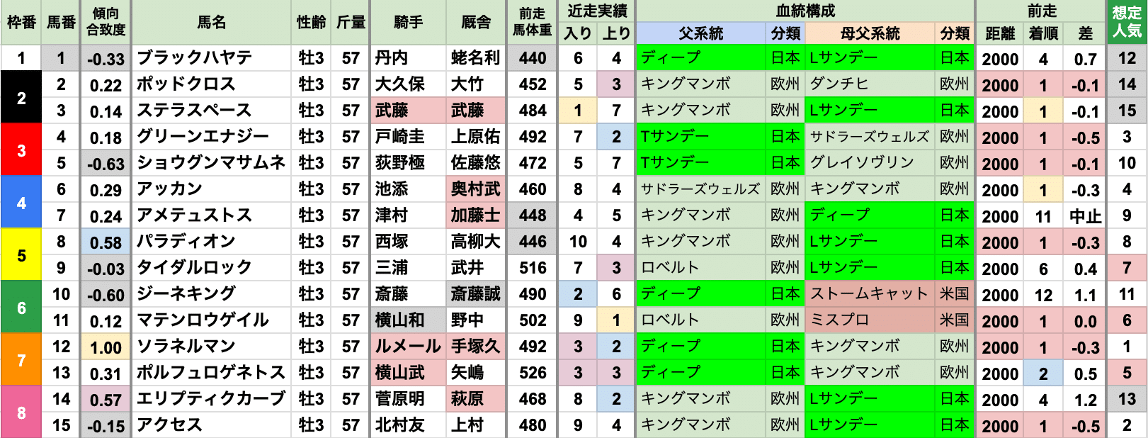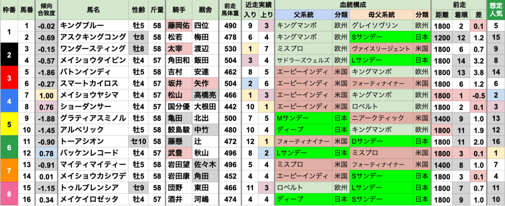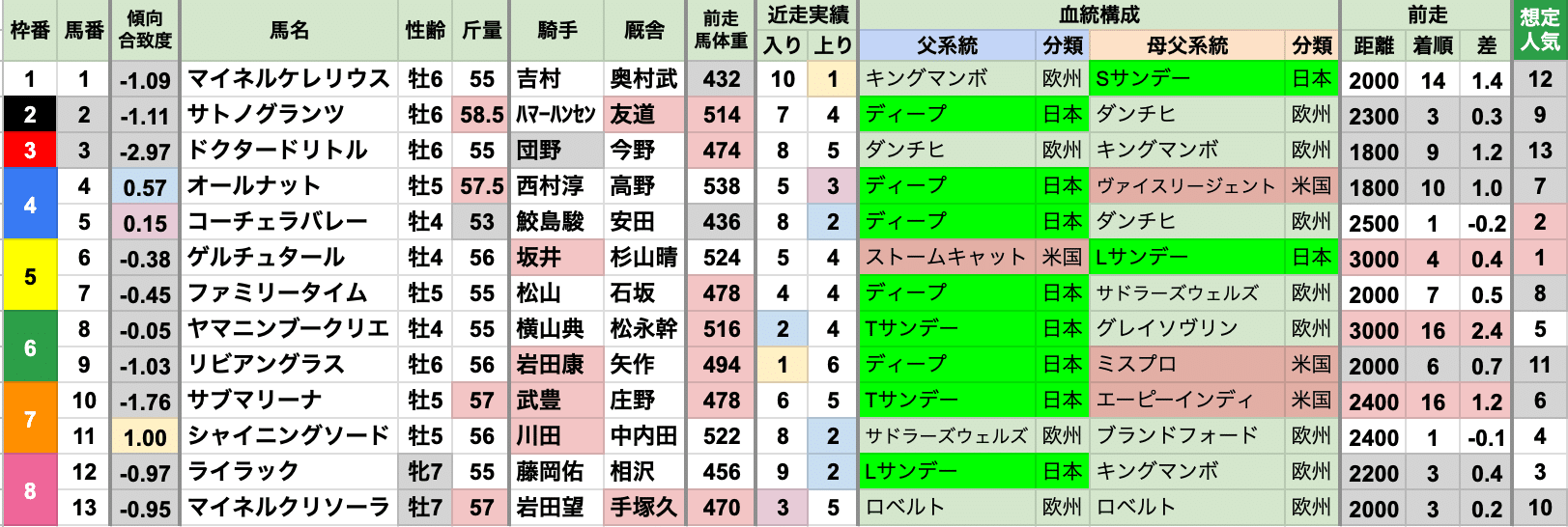| 斤量 | 設定斤量49-59.5kg、勝ち馬斤量52-59kg 2013〜2022年の10年間では55kg以下が9勝する軽ハンデ有利だったが、 2023年以降は57kg以上が3連勝中 |