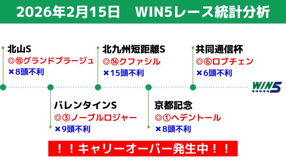2/15(日)のWIN5対象レースの統計データを分析し、買える馬/消せる馬を検討します