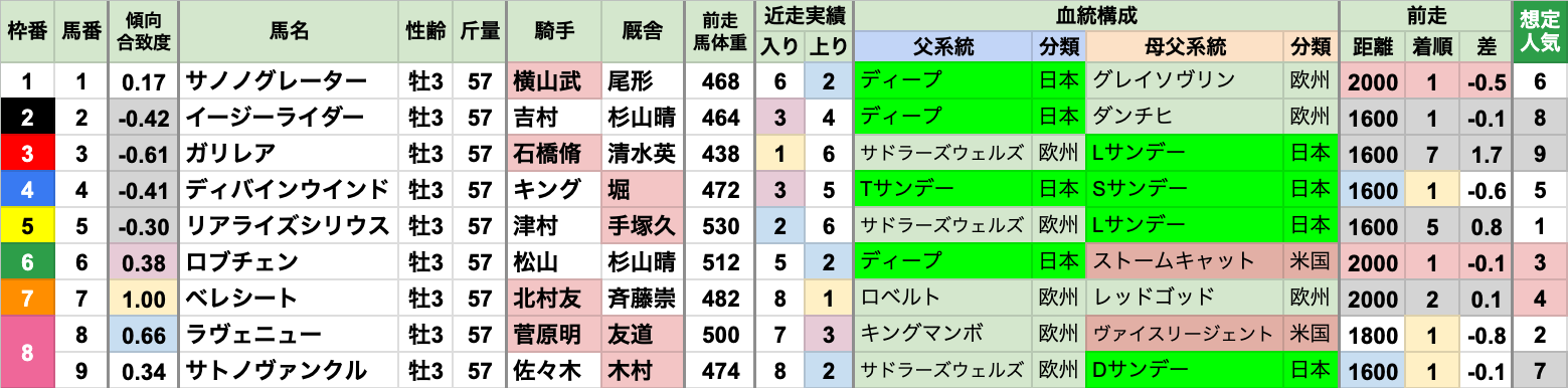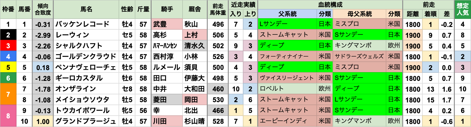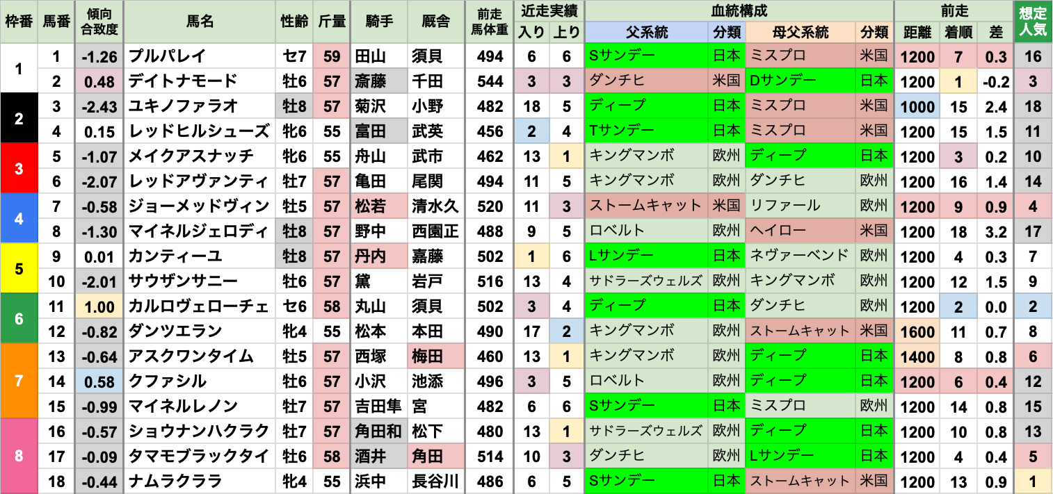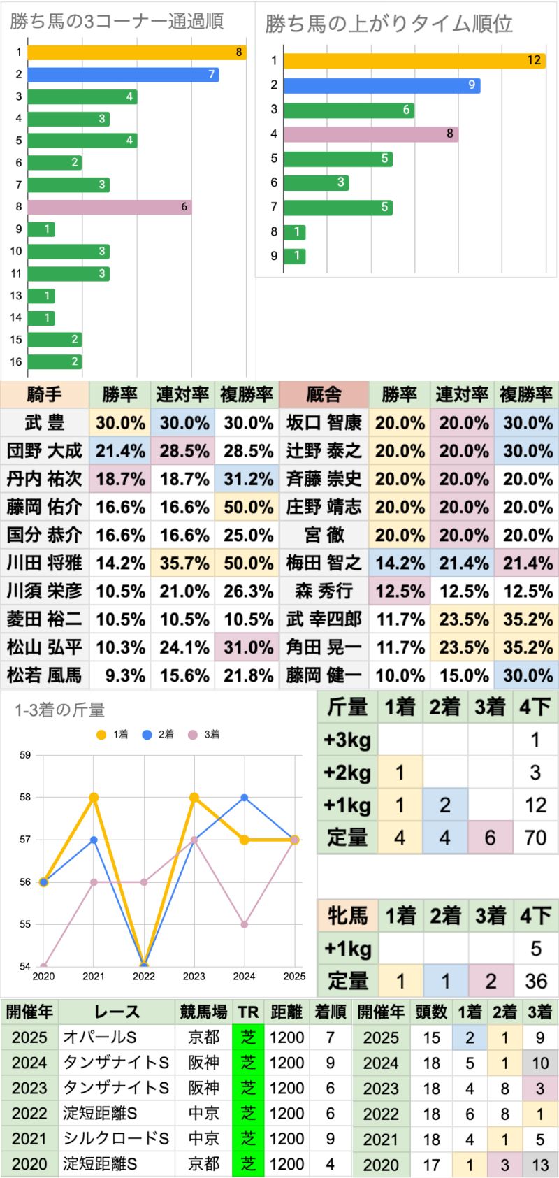 前走レースの重複は、タンザナイトSと淀短距離Sが2頭ずつ